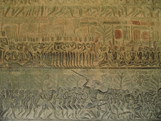 Banteay Samré zeigt eine überwiegend hinduistische Bilderwelt, am zentralen Tempelturm (Prasat) ungewöhnlicherweise jedoch auch Reliefs des buddhistischen Themenkreises. Der Tempel wurde in der ersten Hälfte des 12. Jahrhunderts errichtet.